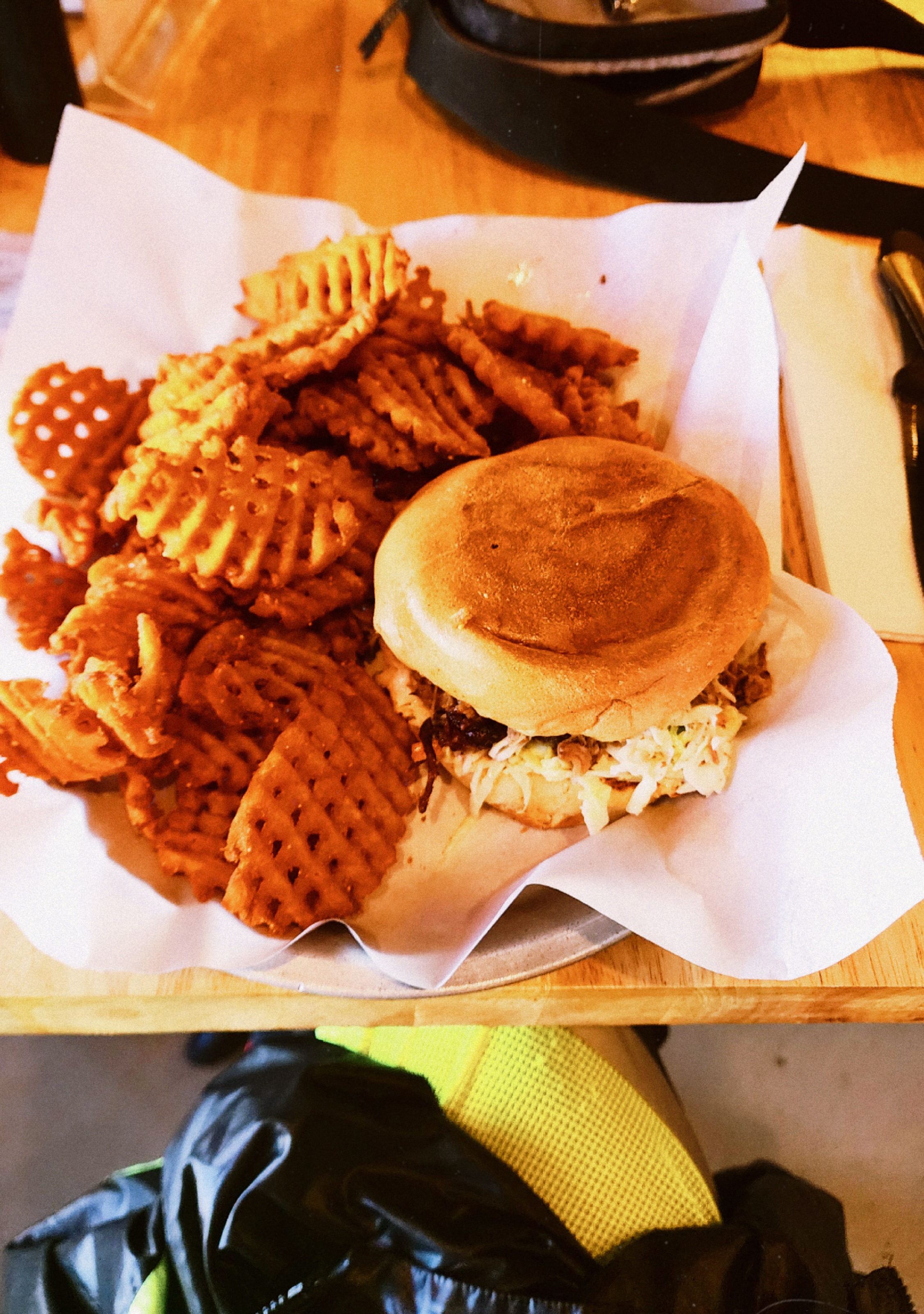 I was directed to sit anywhere, and chose a high two-top near the door to look out the window. Hardly any time later, she brought my order out to me, and it was time to eat! My slow-roasted pork sandwich arrived on a tasty, toasted bun with a helping of house-made slaw next to a comically large bed of crispy and sweet waffle-cut fries. Eating the sandwich was an ordeal of its own, as the soft meat and slippery cabbage were falling out of my bun at every movement. The slow-roasted pork was lightly seasoned and juicy beyond belief. Combined with the delicate, yet crisp flavor of the slaw, the sweetness of the bun, and the salt of the waffle fries, my meal was everything I needed at that moment. It cannot go unmentioned, however, that between the juicy meat and the slaw dressing, this sandwich is quite literally the wettest sandwich I have ever eaten. A French Dip would feel like the Nevada desert compared to this bad boy.